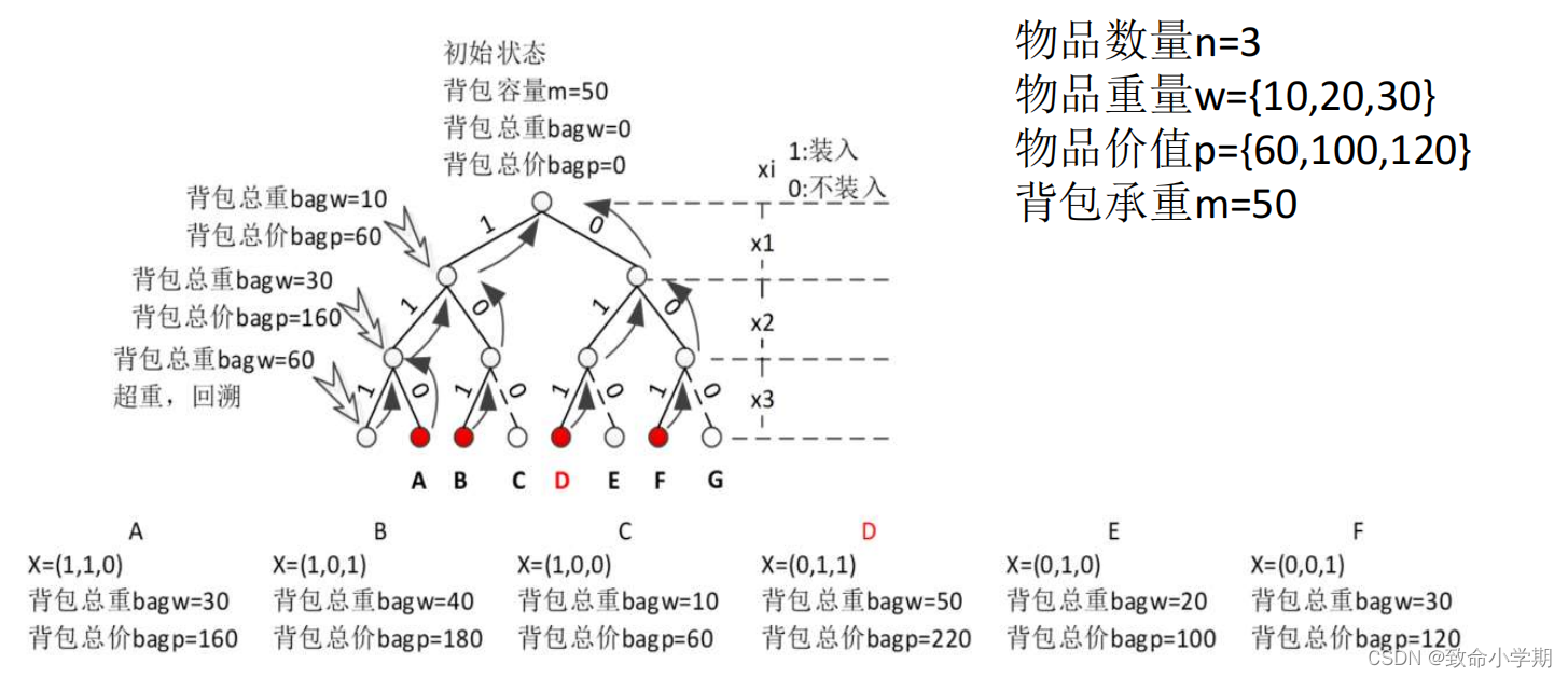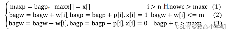 {if(i>n-1){if(bagp>maxp){maxp=bagp;for(int j=0;j<n;j++){maxx[j]=x[j];}}return ;}//r=r-p[i];//对第i层进行搜索,r 减少if(bagw+w[i]<=m)//小于背包总重量(约束条件) {x[i]=1;bagw=bagw+w[i];//更新当前背包重量bagp=bagp+p[i];//更新价值bag(i+1);//下一层bagw=bagw-w[i];//回溯bagp=bagp-p[i]; } if(bagp+r >maxp)//如果当前价值+剩余价值> 当前最大价值 还有递归的必要//如果是 当前价值+剩余价值 <= 当前最大价值,那么其实就没有递归的必要了 {x[i]=0;//右子树 bag(i+1);}r=r+p[i];//对第i层进行搜索回来,回复r }int main()