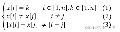 bool ok(int i){for(int j=1;j<i;j++)//值相等 或 在对角线上 if(x[i]==x[j]||(abs(x[i]-x[j])==(i-j)))return false;return true;