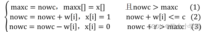 void search (int i){ /*递归法*/if(i>n){//搜索完if(nowc>maxc){//现在重量值maxc=nowc;for(int j=1;j<=n;j++)maxx[j]=x[j];}return;}//剩余量 r=r-w[i]; //搜索第i层,同时减少可用量//若不装,则岸上重量减去if(nowc+w[i]<=c){ //满足约束,左子树x[i]=1;nowc=nowc+w[i];search(i+1);//递归搜索i+1层nowc=nowc-w[i];//回溯后恢复nowc} /*下面开始搜索右子树*/if(nowc+r>maxc){ /*大于当前最优*/x[i]=0;search(i+1); //递归搜索i+1层}r=r+w[i];//对第i层搜索完毕,恢复r