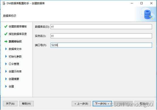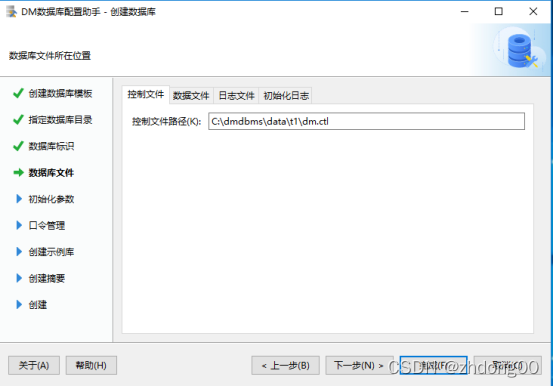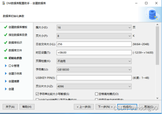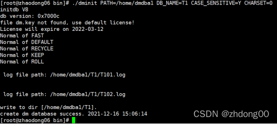 ./dminit PATH=/home/dmdba1(数据库的存放目录) DB_NAME=T1(数据库的名字) CASE_SENSITIVE=Y(开启大小写敏感) CHARSET=0(字符集为GB18030)
