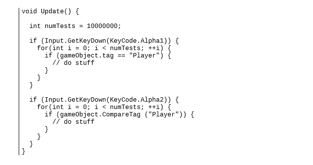 tag和name是GameObject中会产生这种现象的两个属性,我们应该尽量少的在运行时调用这两个属性,比如用在Editor编程中更合适。但是Tag这个东西太常用也非常有用,在运行时经常会用到,这会经常带来麻烦,举个栗子,下边的代码在每次迭代中都会产生额外的内存开销:
