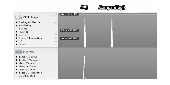 很不幸的是Unity对于name属性没有提供不消耗内存的方法,所以有的时候需要调用name属性去判断时,不如考虑考虑用tag来代替。值得一提的是ComparTag方法调用时传入的字符串,比如"Player"并不会产生额外的内存开销,因为在初始化时已经分配好这些硬编码的字符串,这里这是运行时的引用。