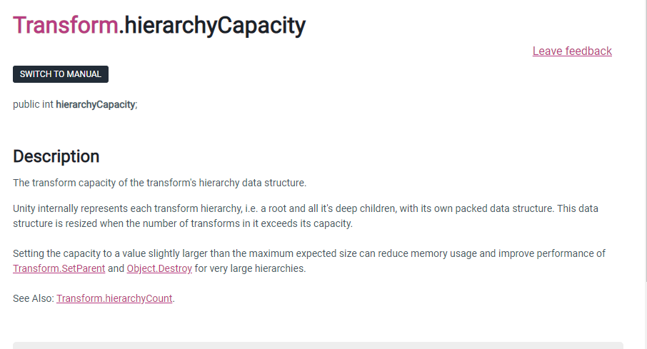 另一种方法是在我们需要之前就给root Transform提前分配更大的内存buffer,从而避免在同一帧里既需要重新给GameObject认爹还需要扩展内存Buffer,这个操作可以通过修改Transform的hierarchyCapacity属性达到,如果我们可以提前就预估好有多少个儿子,那就可以节省很多的内存分配操作。