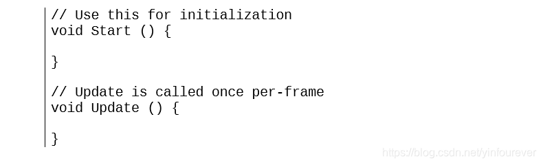 特别需要注意的是Start 和 Update方法。因为当创建一个脚本时,Unity为它默认的添加了这俩个方法。