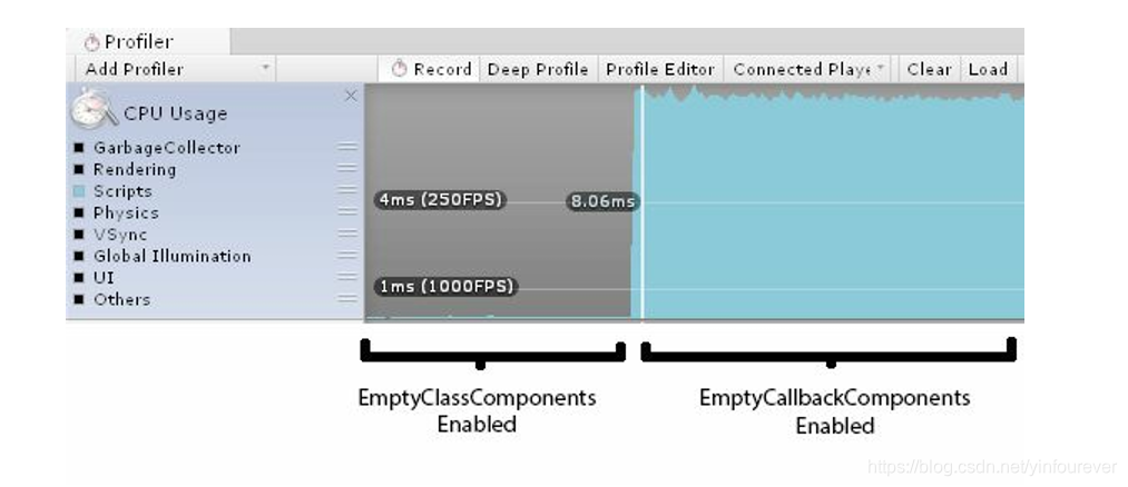 特别需要警惕的是一个GameObject可能会有多个component,如果componet都有没必要的空函数,后果很残忍。