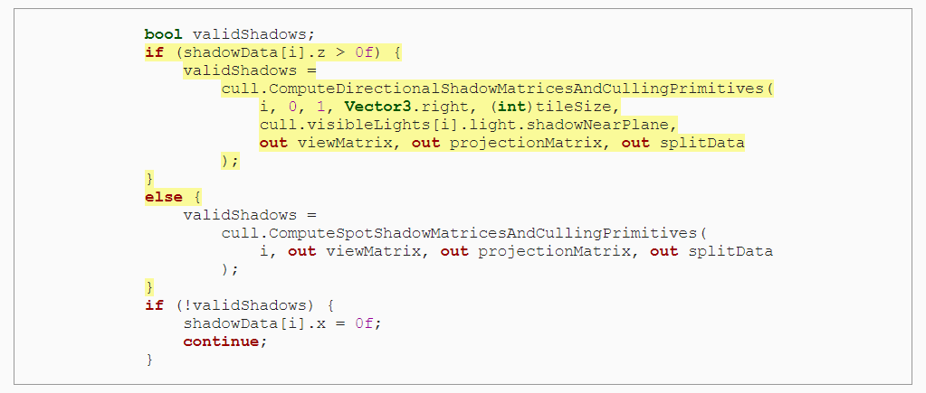如果阴影数据表明我们处理的是方向光,就调用ComputeDirectionalShadowMatricesAndCullingPrimitives 。这个方法有更多的参数,因为它支持阴影级联(这里我们先不用)。第一个参数要求提供一个光源序列,接着是级联的序列以及级联的数量。我们现在用不到级联,所以序列设为0,数量设为1。之后是定义了级联分级的三维向量,我们使用(1,0,0)。然后是整型的图块尺寸和阴影近平面值。最后是投影矩阵等输出参数。