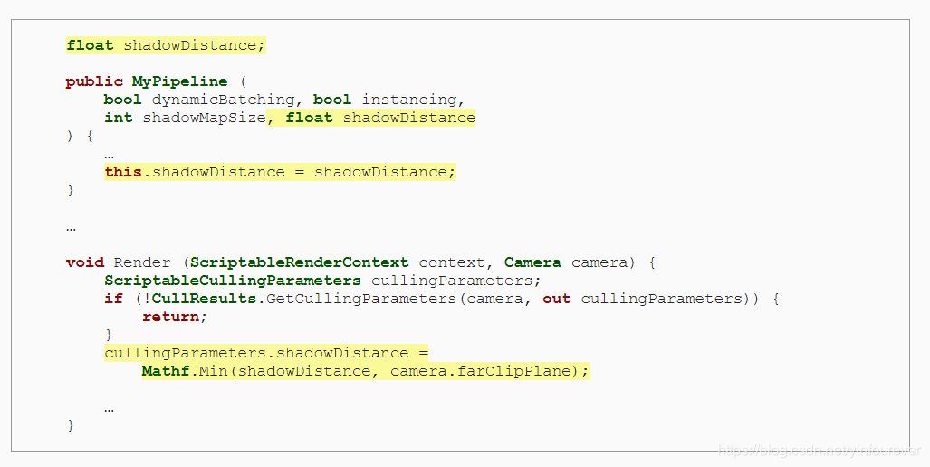 在MyPipeline中为阴影距离添加一个字段,并在构造方法中设置。我们从相机中提取阴影距离并赋值给剔除参数。因为渲染相机可见范围外的阴影没有意义,所以使用阴影距离和相机远平面中的最小值更合理。