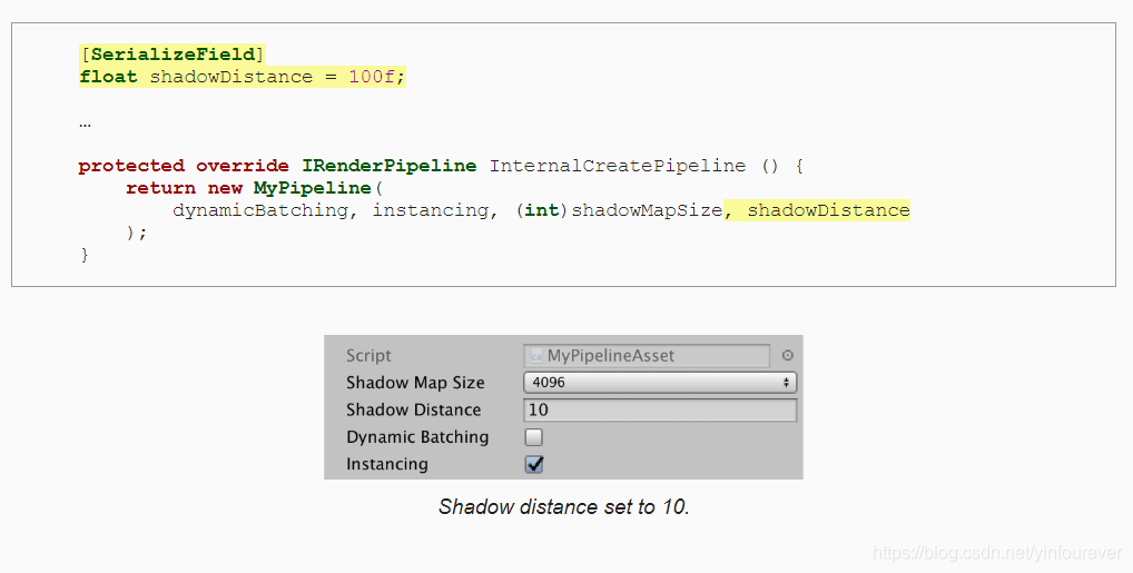 在MyPipelineAsset中为阴影距离添加一个配置选项,并设置一个合理的默认值,比如100。