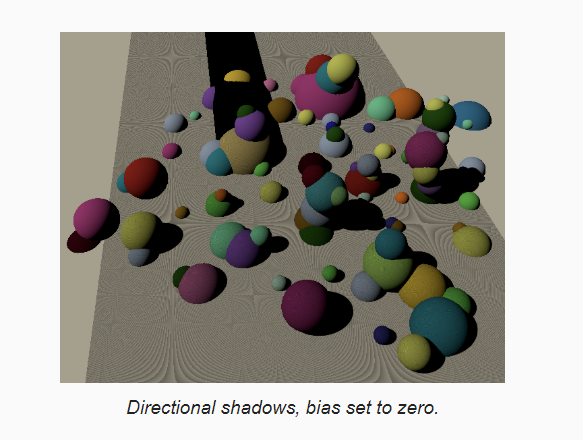 因为偏移设为了0,我们可以大致看到阴影贴图覆盖的区域。和聚光源的阴影不同,方向光的阴影贴图随相机移动而改变。另外,阴影贴图的边缘也会影响超出阴影范围的场景物体,这是因为我们采样坐标会超出贴图边缘(结果会采样边缘的值,因为我们纹理设置的是clamp),这导致贴图的边缘被拉伸至无穷远。当我们的阴影光源多于一个时,拉伸消失了,因为我们为每个图块使用scissoring清理了边缘。