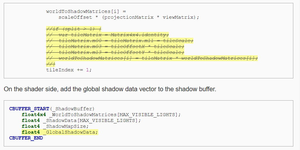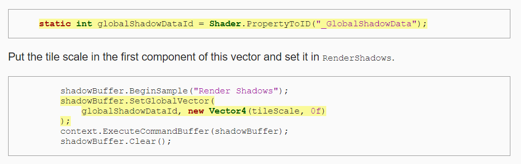 tile scale信息对于变换时是必须的,我们将其传入shader。声明一个全局的vector用于保存阴影信息,将其命名为_GlobalShadowData 并持有它的标识符。