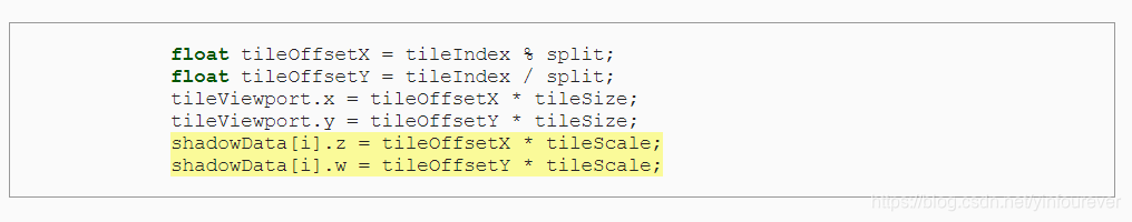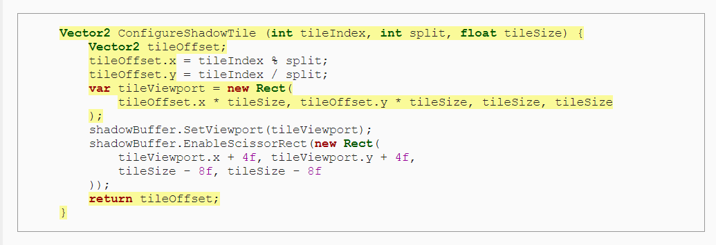 然后是设置阴影tiles。计算tiles偏移,设置视口以及剪裁,偏移值可以用二维向量返回值得到。