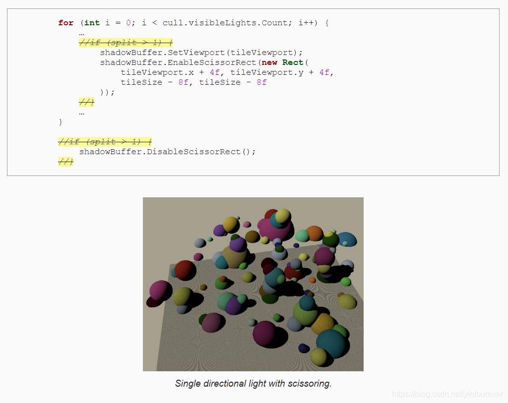 我们解决了在多个图块时的阴影杂乱( shadow soup)问题,但是当场景中仅有一个方向光时阴影贴图的边缘仍会被拉伸。我们在RenderShadows中设置成无论几个光源都使用裁剪来解决这个问题。