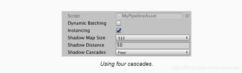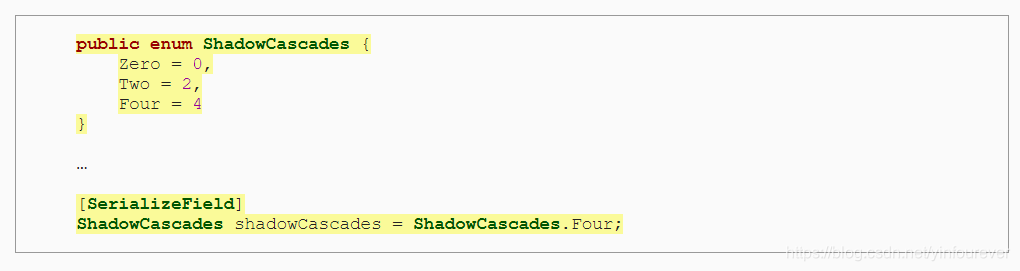 Unity通常为级联阴影数量提供三个选项:0、2、4。我们也一样,在MyPipelineAsset添加一个ShadowCascades枚举用于配置数量,默认为4。