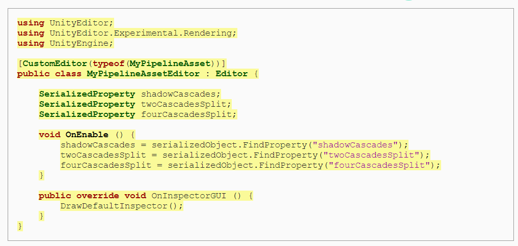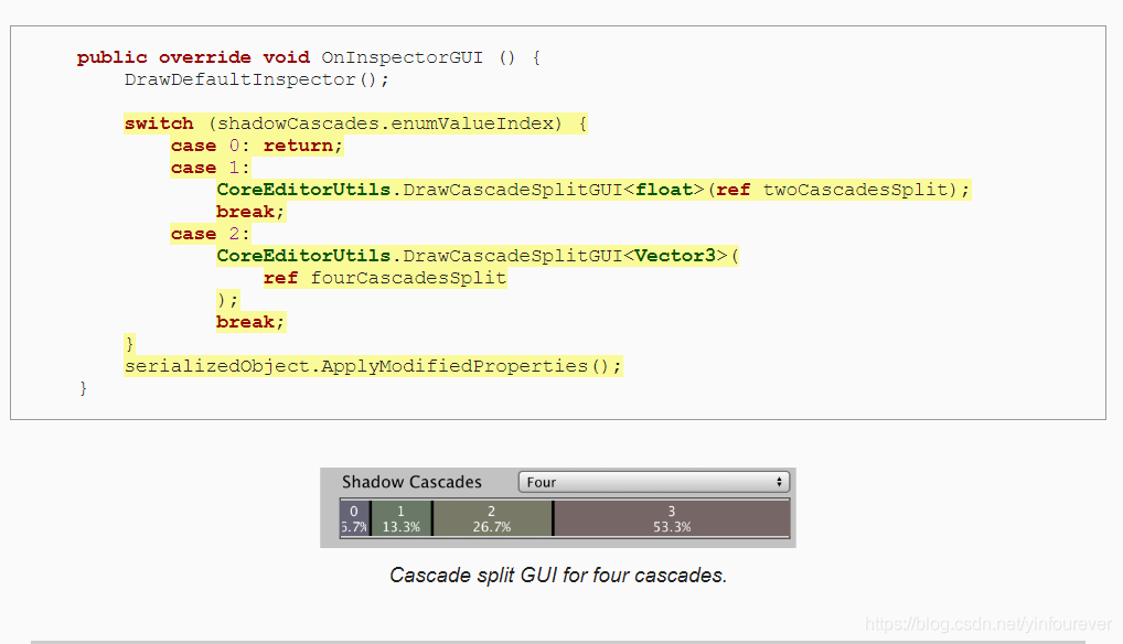 在绘制默认检视器之后使用switch语句来决定我们绘制哪种级联的GUI。使用CoreEditorUtils.DrawCascadeSplitGUI 函数去绘制,之后调用序列化对象的ApplyModifiedProperties 方法来确保用户的修改可以应用到我们的资源中。
