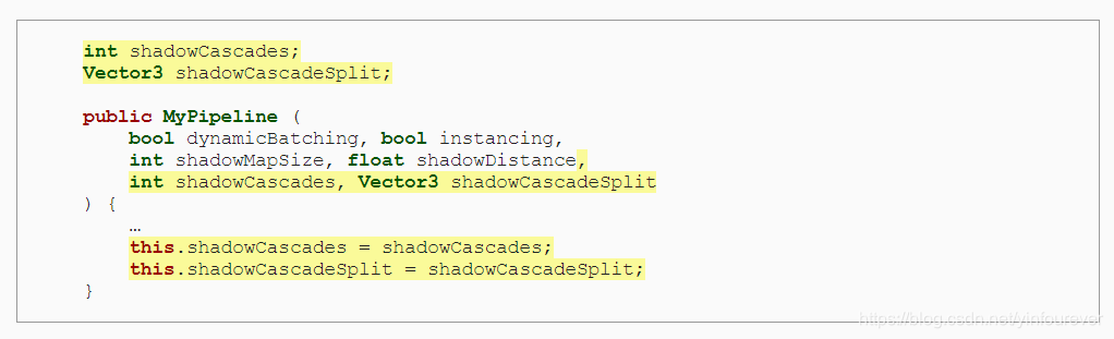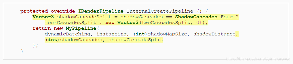 当MyPipelineAsset调用渲染管线的构造方法是,总是要求传入一个分布情况向量,即使实际是二段级联。这这种情况下,我们将唯一的分布值作为向量的第一个分量,另外两个设为0。