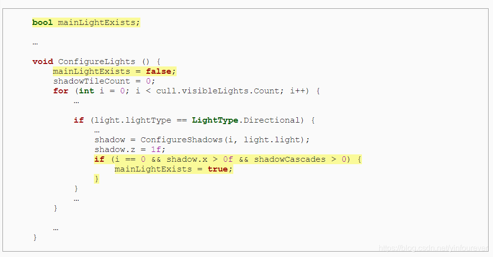 主光源总是可见光列表中的第一个元素。我们可以在ConfigureLights中判断第一个光源是否符合标准,如果是方向光、阴影强度为正数,并且开启了阴影级联,那就说明是有效的主光源。我们用一个bool字段来记录这个情况。