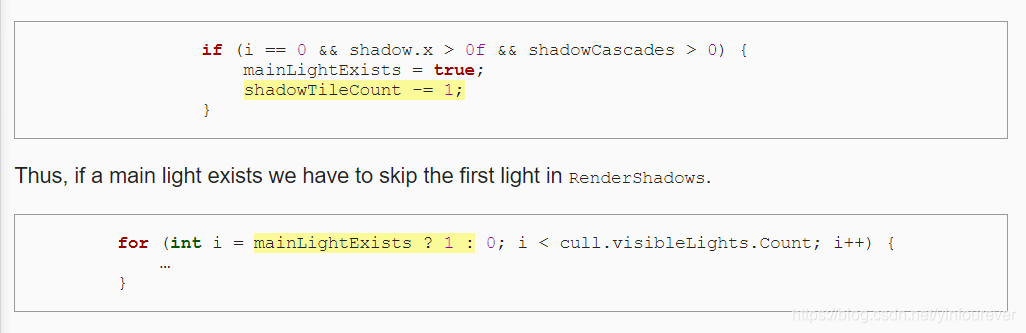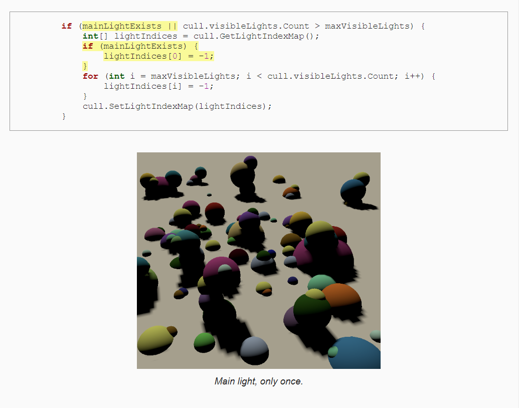 我们会为主光源提供单独的渲染贴图,所以当我们拥有主光源时,让图块计数减1,并且在RenderShadows函数中将其从常规阴影贴图渲染中排除。
