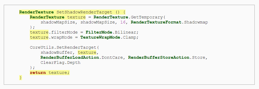 首先是关于阴影渲染目标的设置,两者在这部分的代码是相同的。我们只需要用两个字段记录两者渲染目标对应的渲染纹理即可。