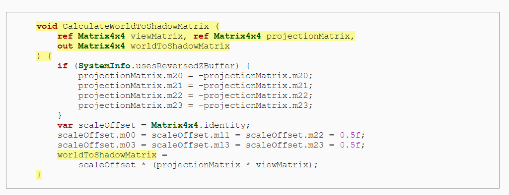 再然后,计算world-to-shadow矩阵这部分也可以放在一个单独的方法里,我们将视角和投影矩阵作为引用类型的参数传入,这样可以避免不必要的拷贝变量。同样,将world-to-shadow矩阵作为输出参数。