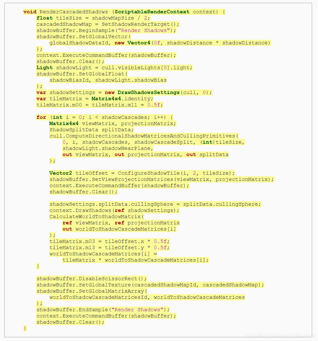 创建一个RenderCascadedShadows方法,首先复制RenderShadows的代码。接下来就简单了,我们不需要考虑聚光源并且只会用到第一个光源。我们不需要处理每个光源的阴影数据,而且阴影设置肯定是开启级联的。级联不是四段就是两段,也就是说阴影贴图总是分为四个tile。