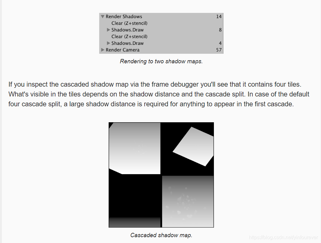 现在我们最终可能有0张,一张或者两张渲染纹理。如果只有主光源,只需要渲染级联阴影贴图。如果有另外带阴影的光源还需要渲染常规的阴影贴图。或者我们有阴影但没有主光源,那我们就只需要常规阴影贴图。如果你在frame debugger中检查级联阴影贴图,你会看到它由四个图块组成。它们内容是否可见取决于阴影距离和级联分布。