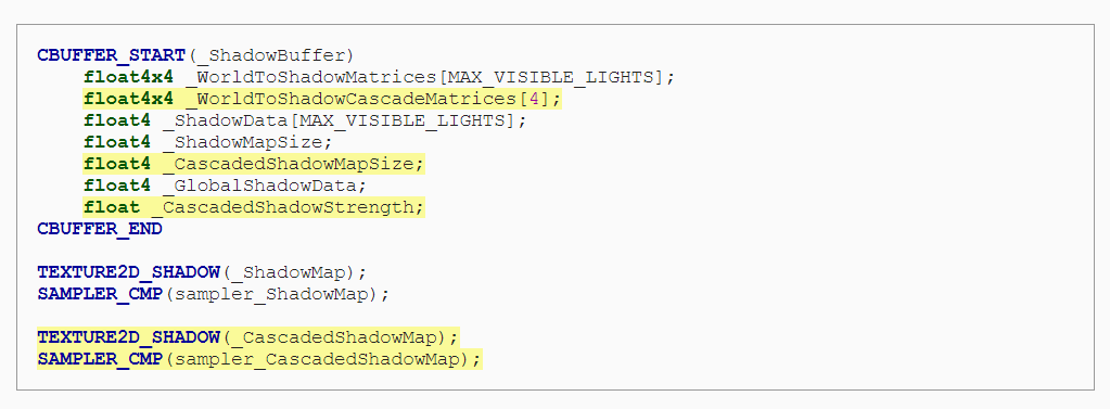 之后向shadow buffer中添加所需的变量,定义级联阴影贴图纹理和采样器
