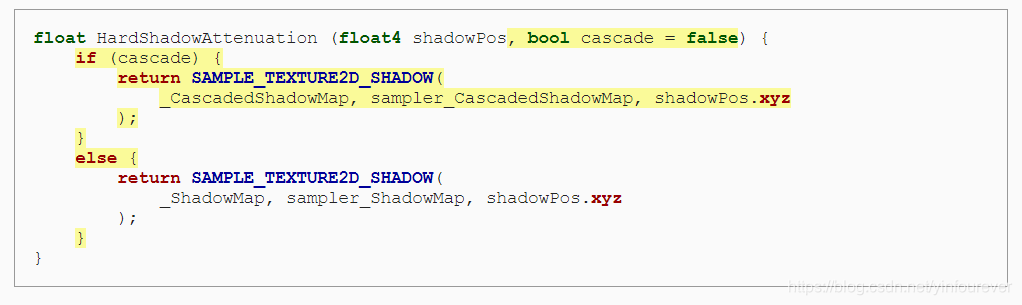 添加一个表明是否采样级联阴影的bool参数来使HardShadowAttenuation既可以用于常规的阴影采样也可以用于级联阴影,参数默认为false。用这个bool值来决定具体使用哪张纹理和采样器。我们使用的bool参数是硬编码的,也就是说在实际编译时并不会产生条件分支。