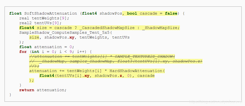 SoftShadowAttenuation 也一样,不过在这里只需要选择正确的纹理就好了,其余的由HardShadowAttenuation 函数完成,没必要再写一遍。