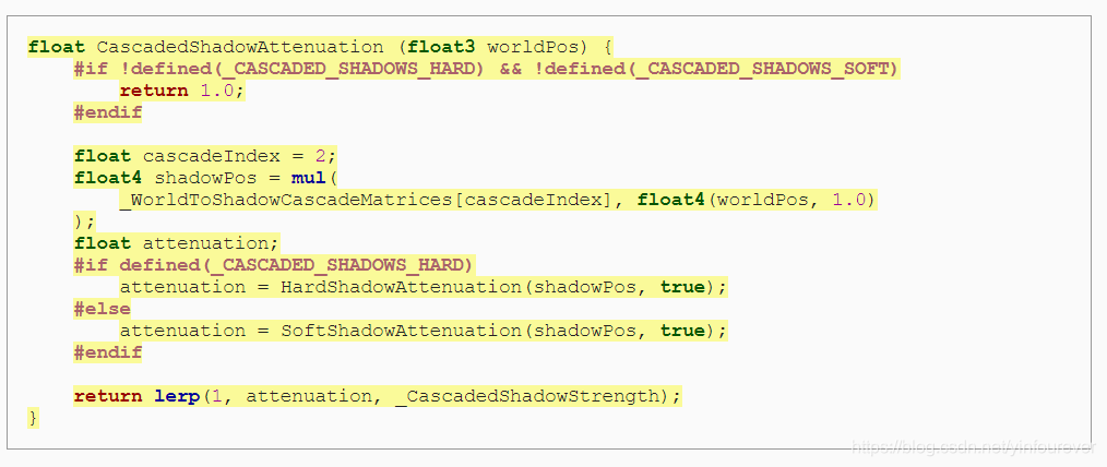 创建一个CascadedShadowAttenuation 方法,他就像ShadowAttenuation的简化版。如果没有级联阴影,衰减直接设为1,反之才会计算阴影位置获取软硬阴影的衰减值并应用应用强度。