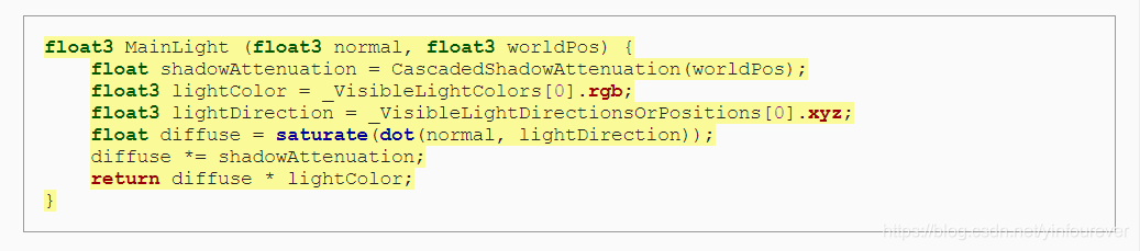 接下来,创建一个MainLight函数来计算主光源,它和DiffuseLight方法做的事一样,但是限制了只计算索引为0的方向光,并且使用CascadedShadowAttenuation 来获取阴影