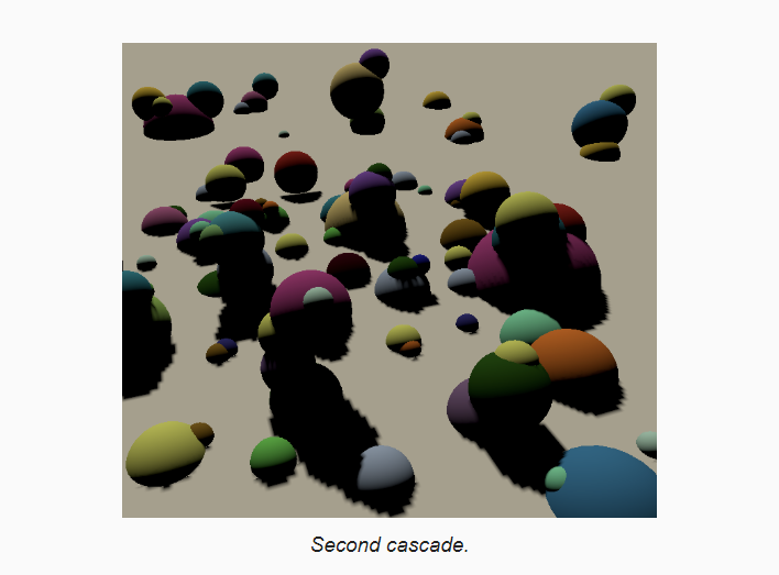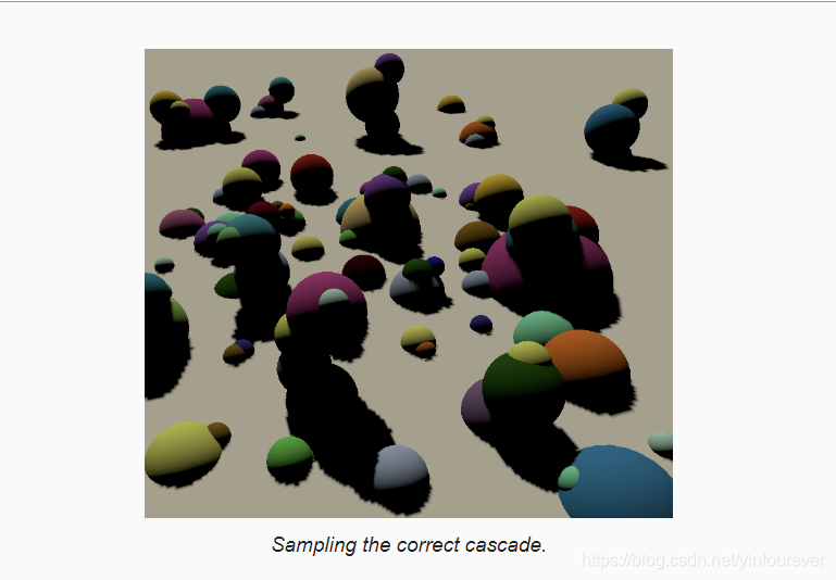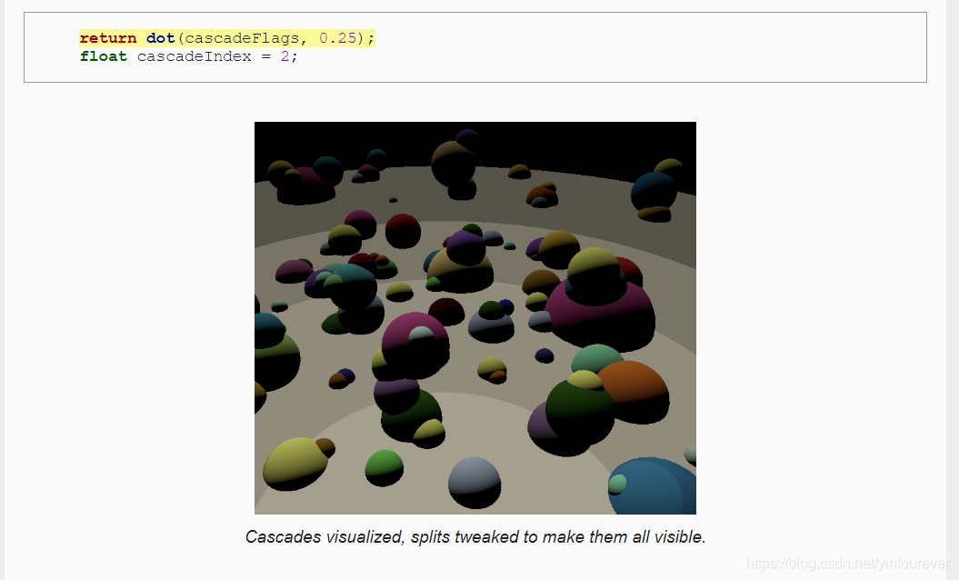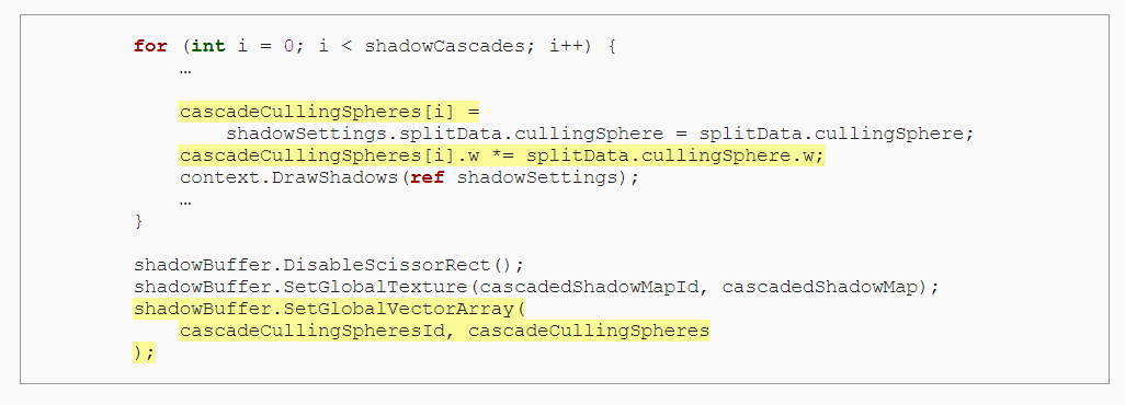 在RenderCascadedShadows函数里我们可以获取每个级联的剔除球。我们只需要简单的把它拷贝到我们的数组然后再传给shader就ok了。因为在判断片元位于哪个剔除球时只会用到半径的平方,所以我们传入半径的平方来减少shader的运算。
