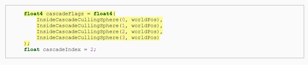 在CascadedShadowAttenuation里为四个剔除球各调用一次这个方法。返回1表示该点位于剔除球内,返回0就在球外面。返回值就是表示这些球是否有效的标志。在确定级联等级前将这四个值放在一个flaot4类型变量中。