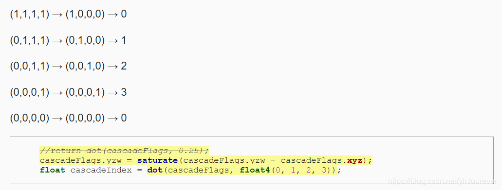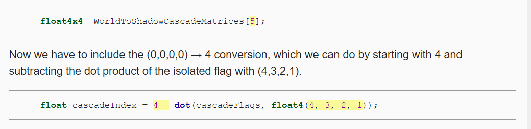 增加shader中对应数组的长度,并完成(0,0,0,0) → 4的转换,我们该为将值和(4,3,2,1)点乘,让4减去它来得到级联等级