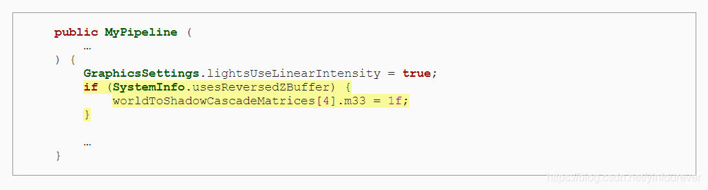 然而,如果z缓冲区反转,那我们就得将阴影空间的z坐标设为1才能表示近平面,我们在构造函数把这个矩阵的m33字段改为1即可。