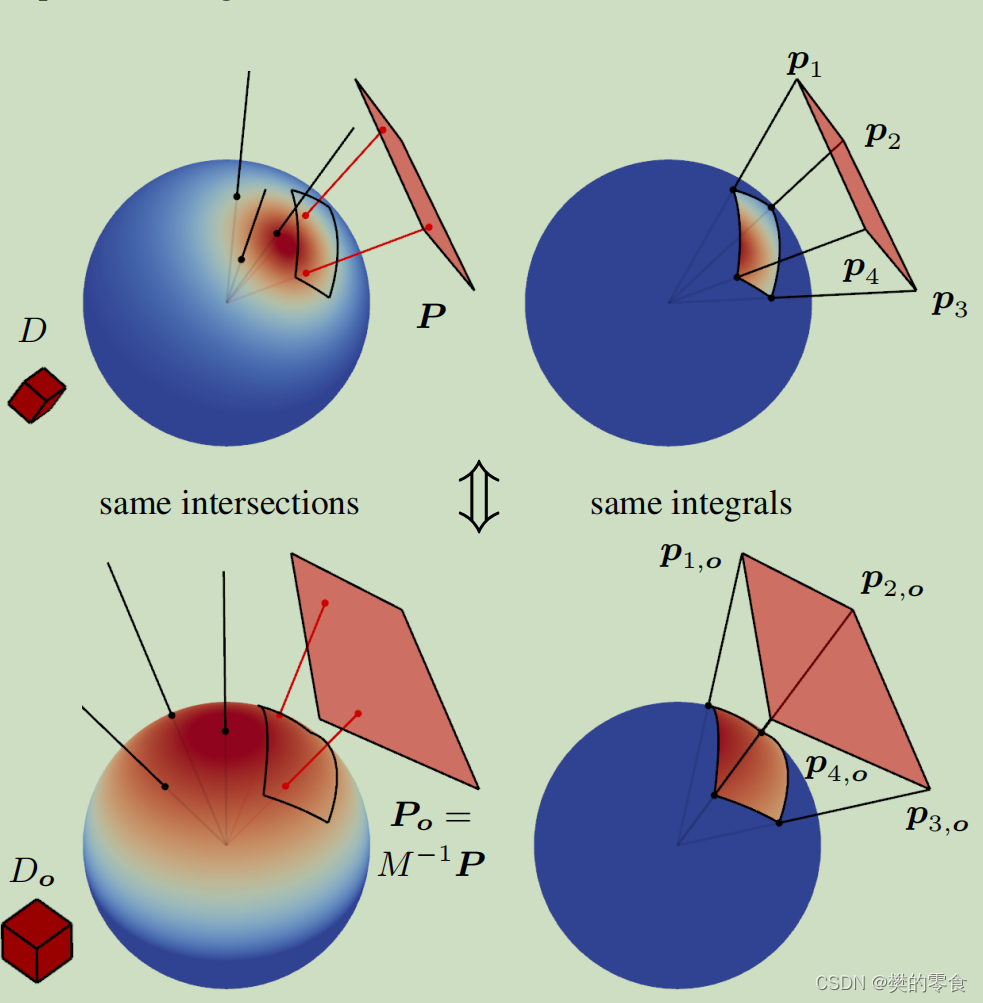 我们在DoD_{o}Do上采样一个方向向量ωo\omega_{o}ωo,那么我们对这个方向向量做一个线性变换,也就是做一个MMM矩阵乘法变换为一个新的方向向量ω\omegaω。