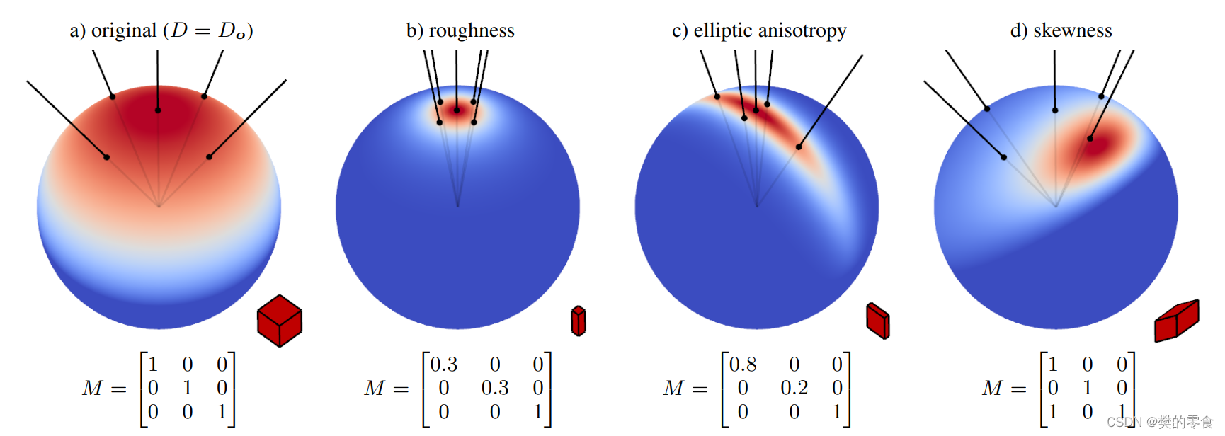 如果我们有一个上半球的余弦分布函数(Do)(D_{o})(Do),并对这个余弦分布函数进行一个矩阵(M)(M)(M)变换,变换为一个新的分布函数(D)(D)(D)。