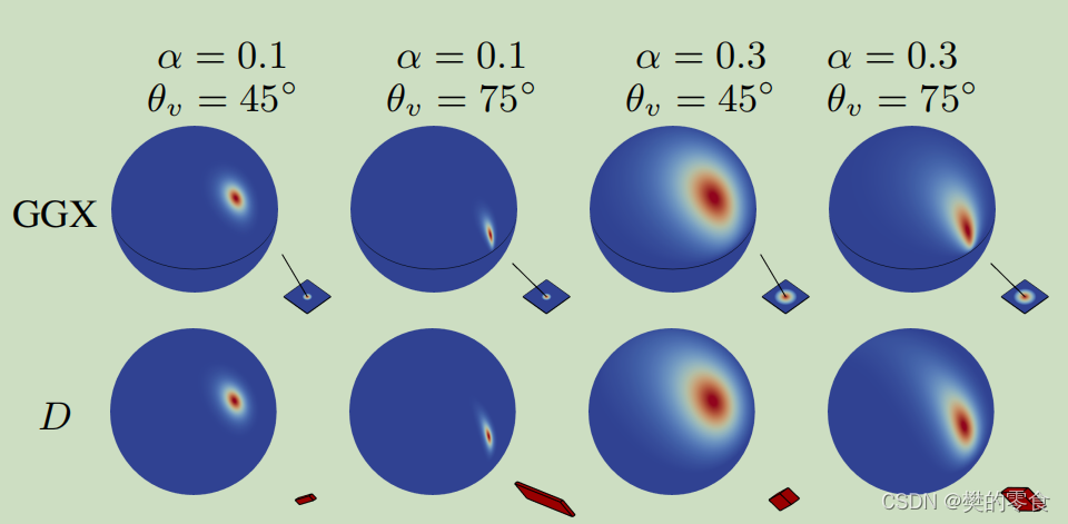 对于一个各项同性的材质而言,BRDF函数分布只依赖于入射方向ωv=(sinθv,0,cosθv)\omega_{v} = (sin\theta_{v},0,cos\theta_{v})ωv=(sinθv,0,cosθv)和粗糙度α\alphaα。