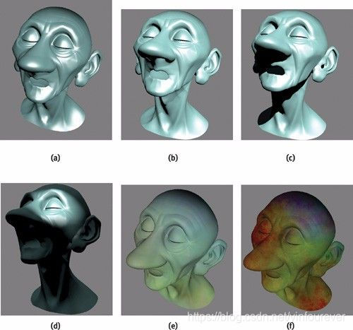 图 (a)Geri由一个光源照明;(b)改变光的权重,修改反射高光对比度;(c)改变阴影颜色,加强阴影;(d)改变谷仓形状(类似窗户一样的遮挡物),创建更戏剧化的姿态;(e)使用一块模糊的纹理cookie,丰富图像;(f)夸大透射的cookie的对比,创建像外星人一样的效果