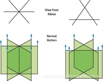 对于线性排布,如果从垂直于多边形的方向观看场景,就会立刻穿帮,看出草地多边形的结构是线性排布的。另外这种情况下草地会看起来非常稀疏。只有在摄像机自动导航,或者渲染无法到达的远距离草地时,才会考虑这样的排布。为了保证独立于当前视线的良好视觉质量,我们必须交叉地排布草地多边形。已证明,使用星型结构是非常好的。下图给出了“草体”可能的两种变体。