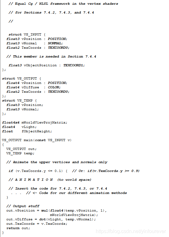 关于草地的动画,基本思想是以三角函数(尤其是正弦和余弦)为基础进行计算,且计算应该考虑到移动的位置和当前时间、风向和强度。我们的每种技术都只移动草体较高的定点。在一个顶点shader中,通过检查纹理坐标,区别较高的顶点和较低的顶点是很容易的。对草纹理而言,所有的上面顶点应该有相同的v坐标。本文首先实现一个顶点shader的框架,在所有的3种动画技术实现方案中都使用该框架,只有纯动画的部分有差别。