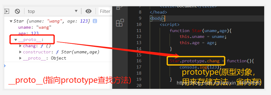 function Star (uname, age) {this.uname = uname;this.age = age;// this.sing = function () {// console.log(this.name + '在唱歌');// }}Star.prototype.sing = function () {console.log(this.uname + '在唱歌');}var zxc = new Star('周星驰', 22);var ldh = new Star('刘德华', 22);// console.log( Star.prototype );ldh.sing();zxc.sing();
