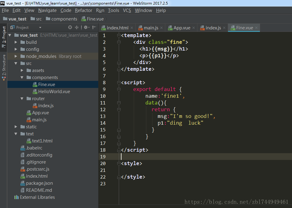 </template><script>export default {name:'fine1',data(){return {msg:"I'm so good!",p1:"ding luck"}}}