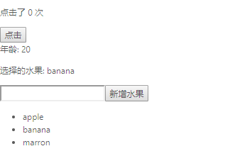 import React, { useState } from 'react'export default function HookTest() {// useState(initState)const [count, setCount] = useState(0)// 多个状态const [age] = useState(20)const [fruit, setFruit] = useState('banana')const [input, setInput] = useState('')const [fruits, setFruits] = useState(['apple', 'banana'])return (<div><p>点击了 {count} 次</p>// 每点击一次按钮,次数+1<button onClick={() => setCount(count + 1)}>点击</button><p>年龄: {age}</p><p>选择的水果: {fruit}</p><p>// 每点当input框输入改变时,更新input的值<input type="text" value={input} onChange={e => setInput(e.target.value)} />// 将水果放入水果列表中.然后清空input<button onClick={()=>{setFruits([...fruits, input]);setInput('')}}>新增水果</button></p><ul>{fruits.map(f => (<li key={f} onClick={() => setFruit(f)}>{f}</li>))}</ul></div>)