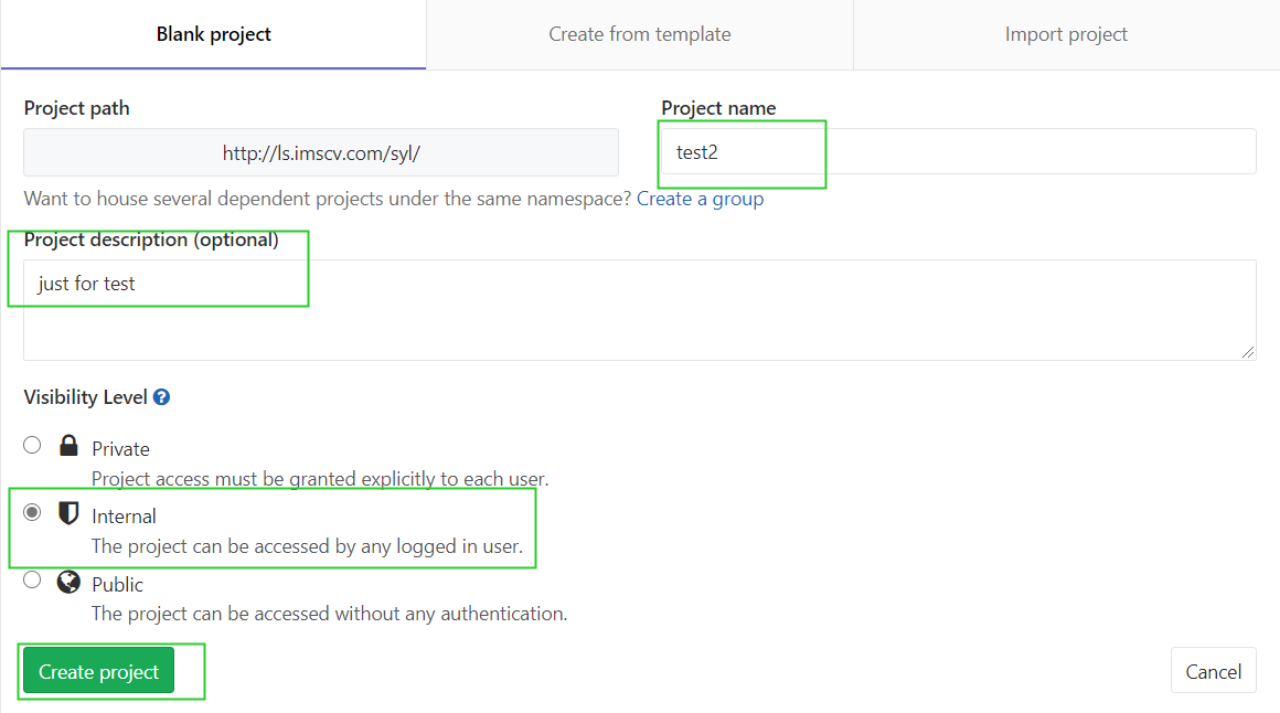 我最开始在Visibility level中选择的是Private,但是后来我push时失败,后来我就选择Internal