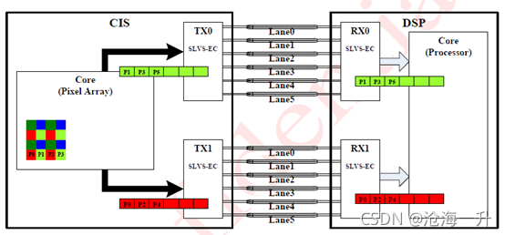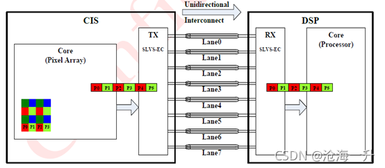 像素数据通过一对SLVS-EC的发射器(TX)和接收器(RX)从一个CIS传输到一个DSP。SLVS-EC只提供从CIS到DSP的单向数据传输。每个SLVS-EC的TX和RX所支持的Lane的最大数量应是8个Lane。