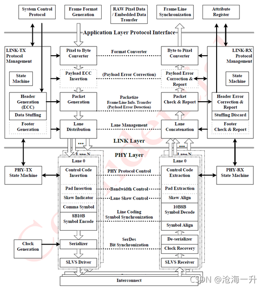 LINK层的主要作用是将帧和行信息添加到从应用层(CIS)输入的像素数据中,将数据组装成数据包,并将其输出到各Lane的PHY层;在RX侧收集各lane的PHY输入的接收数据,从数据包中提取像素数据、帧信息和其他信息,并输出到应用层(DSP),进行纠错编码和解码等处理。