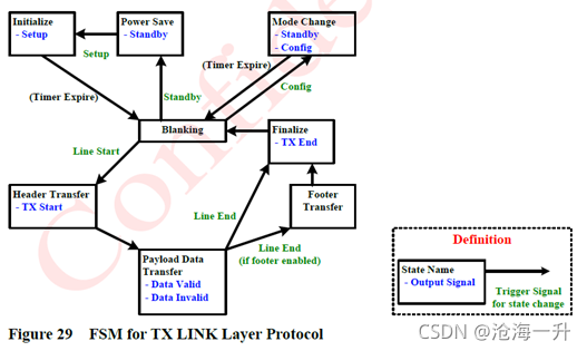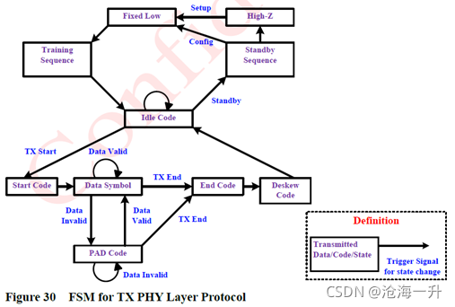 5. Finalize:该状态命令将表示数据包结束的控制代码从LINK层传输到PHY层。6. Mode change:该状态根据配置寄存器的设置,改变LINK层和PHY层的设置