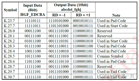 采用8b/10b编码,控制码采用到的编表如下: