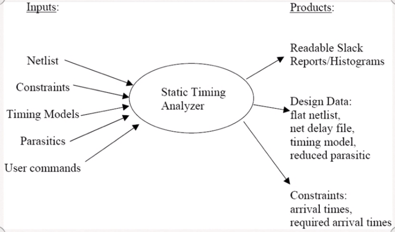 上图我们可以看到静态时序分析在整个芯片设计流程中的位置,可以发现STA几乎涉及后端的全部阶段,是sign off的重要工具。。通过静态时序分析,可以检查设计中的关键路径分布;检查电路中的路径延时是否会导致setup违例;检查电路中是否由于时钟偏移过大导致hold违例;检查时钟树的偏移和延时等情况。此外静态时序分析工具还可以与信号完整性工具结合在一起分析串扰问题。常用的静态时序工具是PrimeTime。其主要输入输出为: