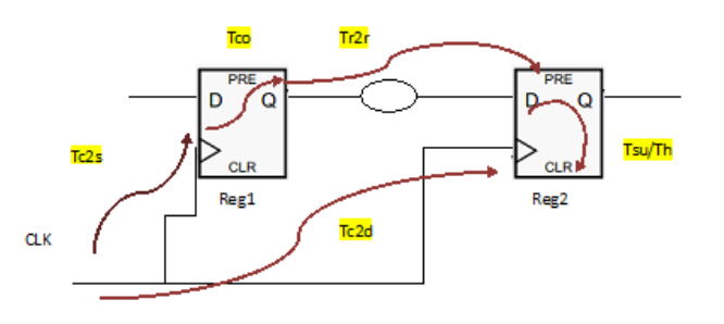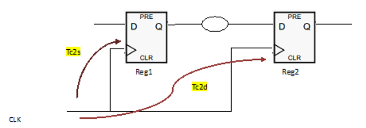 时钟和其它信号的传输一样会有延时的。下图中,时钟信号从时钟源传输到源寄存器的延时定义为Tc2s ,传输到目标寄存器的延时定义为 Tc2d。